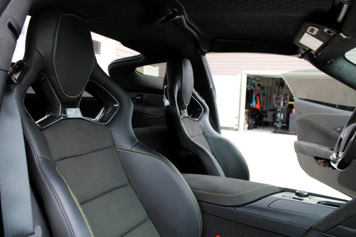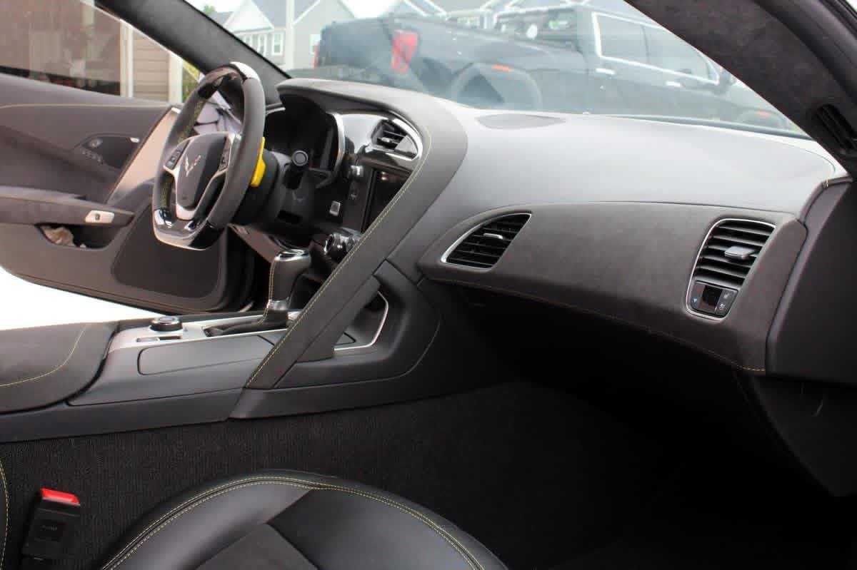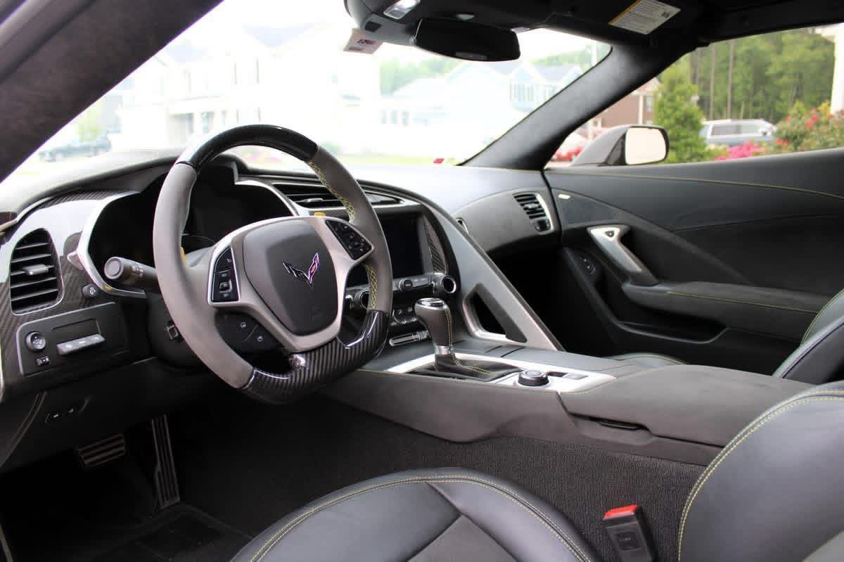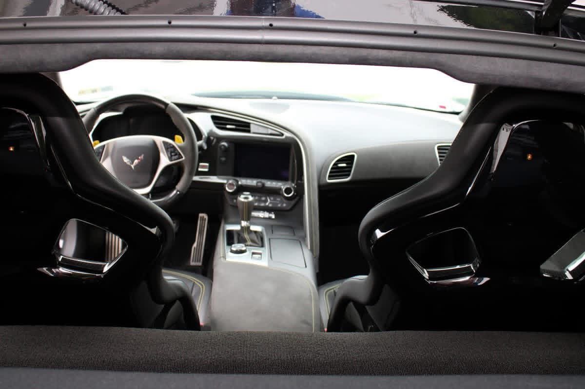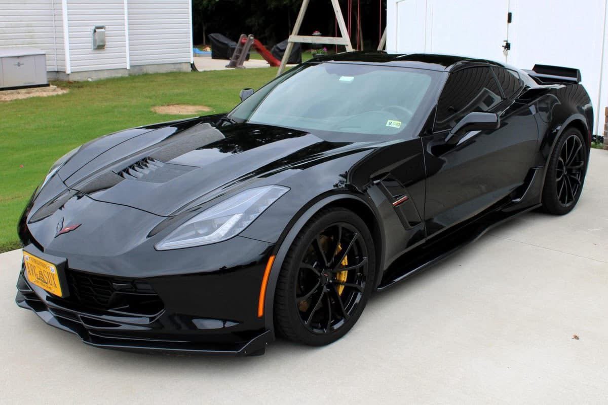 A partial list of notable equipment reported by the seller includes the 3LT Trim, 19-inch front and 20-inch Grand Sport wheels in Satin Black, a Grand Sport performance suspension with Magnetic Selective Ride Control, an electronic limited-slip differential, a variable-valve performance exhaust system, a rear spoiler, and a removable carbon fiber roof panel. Notable modifications reported by the seller are limited to yellow shift paddles.